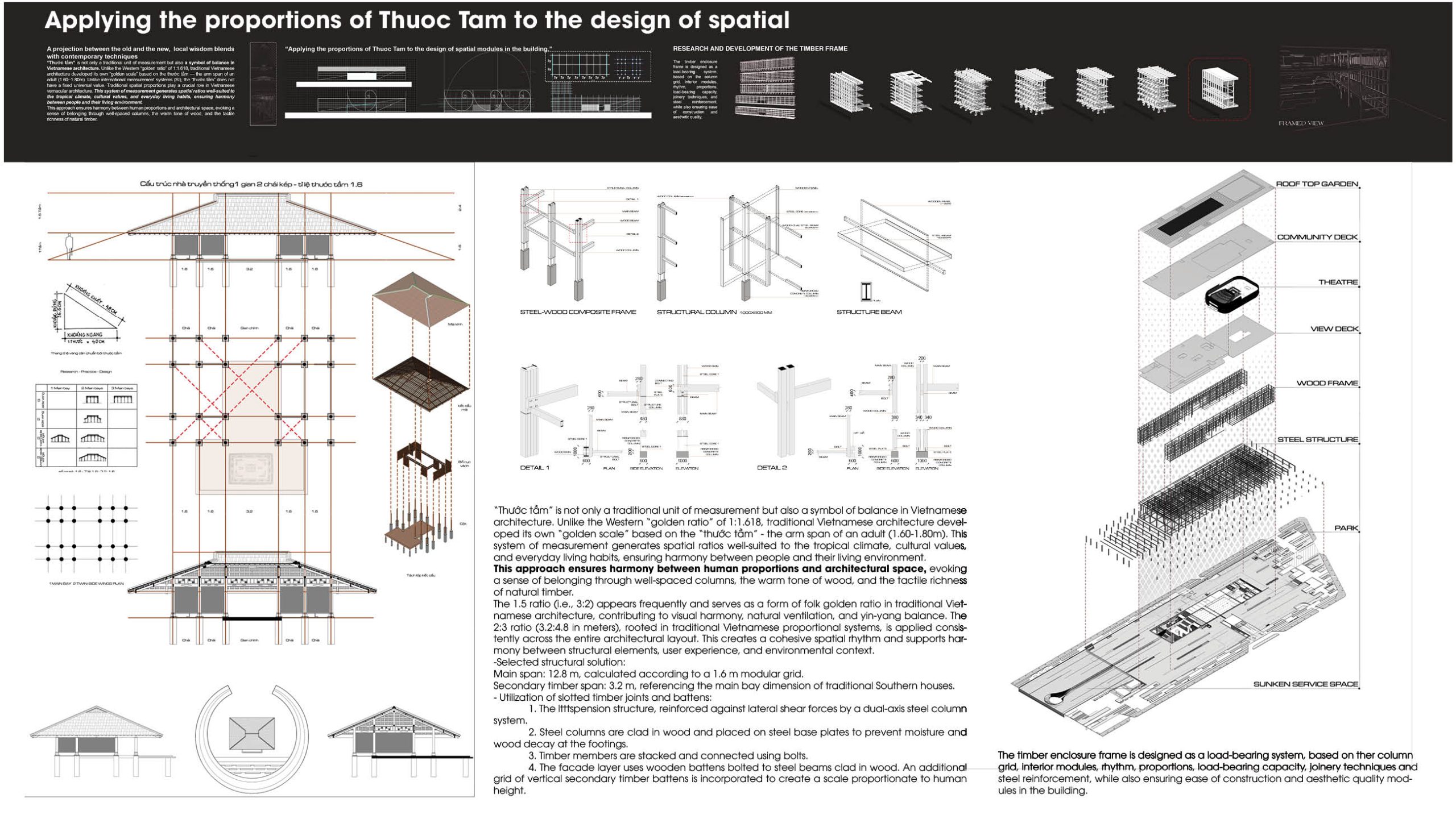– Local identity: Timber, scaled by the traditional thước tầm and a 12.8m grid, create familiar spaces.