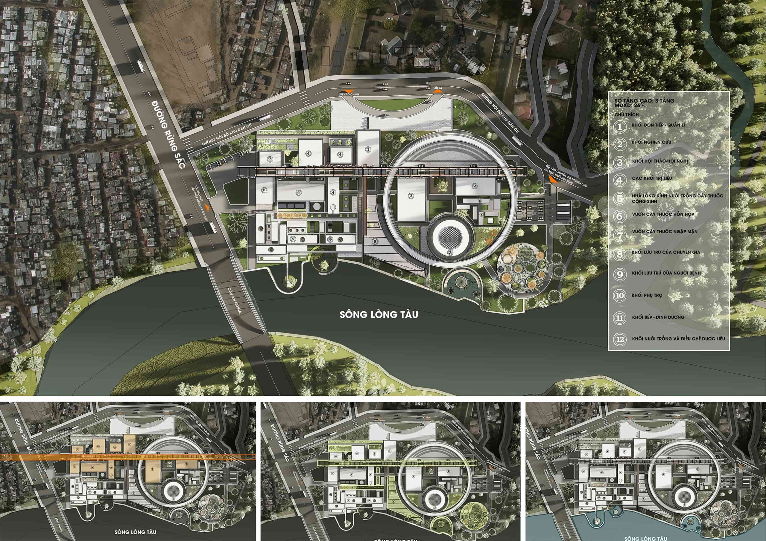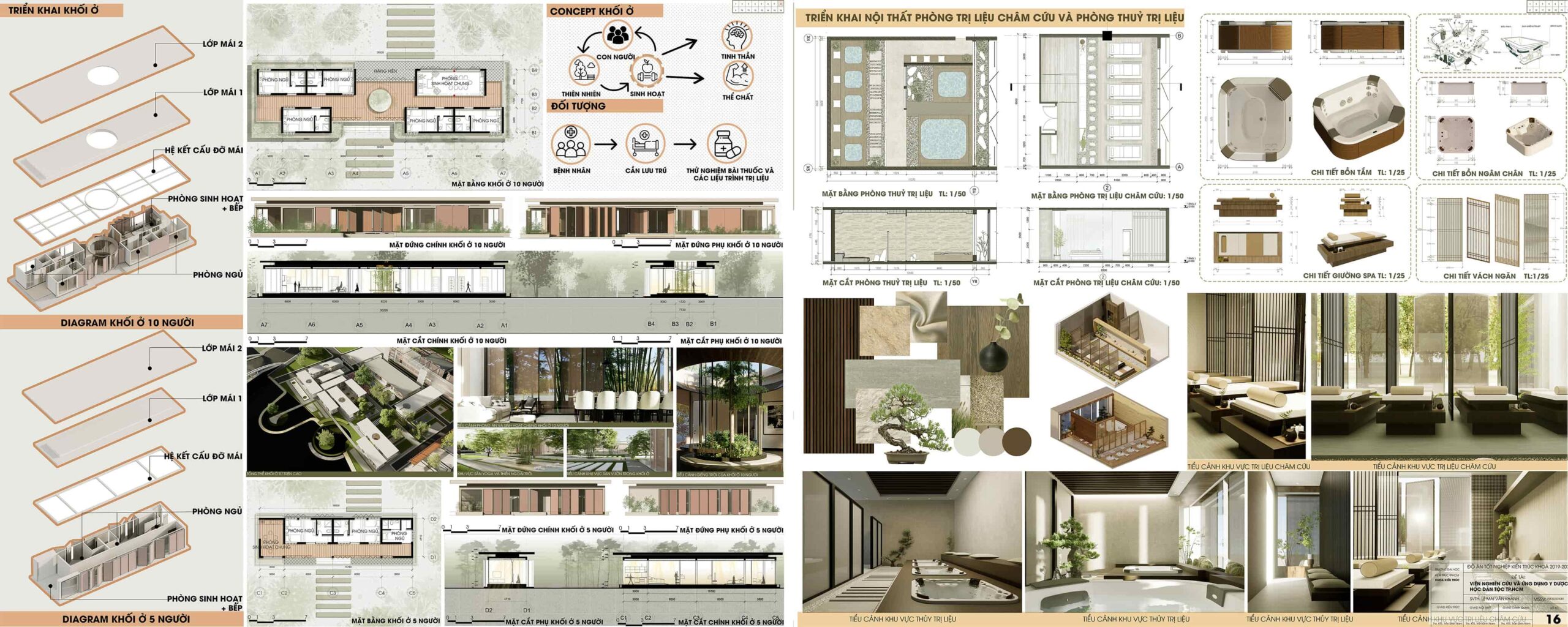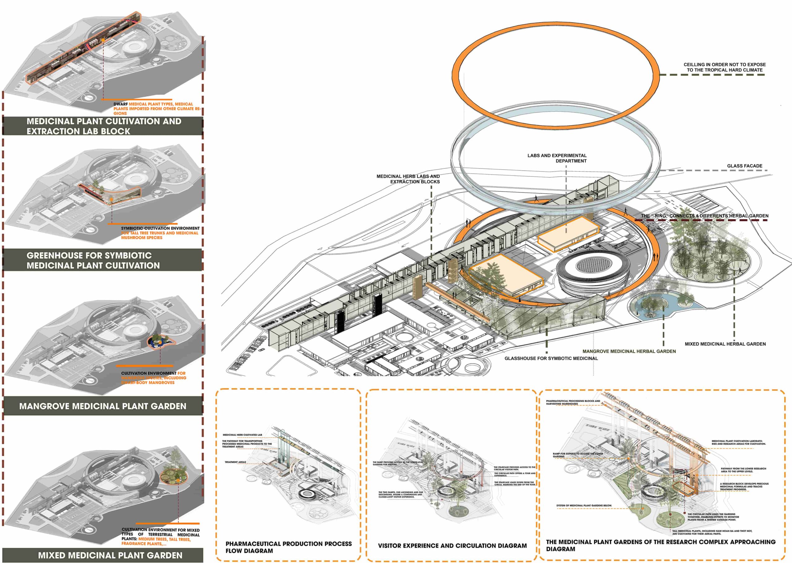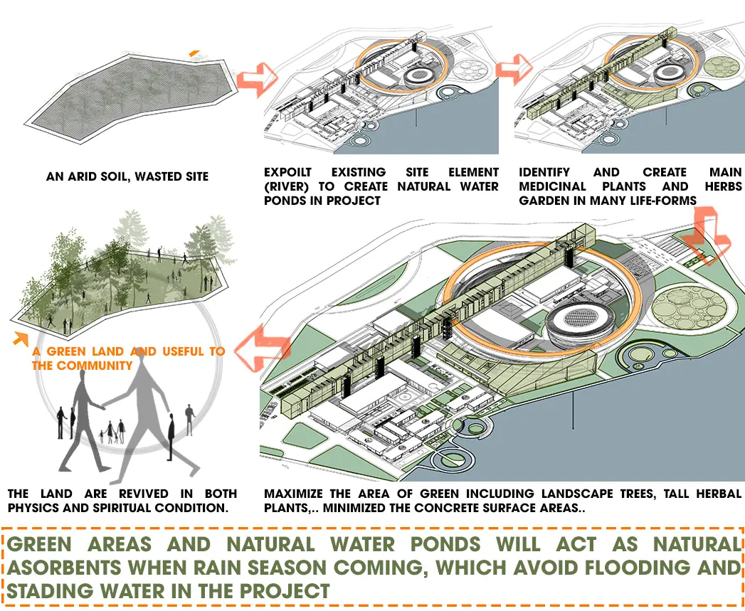 Therefore, the general vision is to design a center specializing in research on traditional medicinal plants and herbs and recreating precious, lost remedies, and conducting clinical trials to apply the remedies to patients. Moreover, the center complex has models of “healing” therapy and health care spaces typical of traditional herbal medicine and pharmacy methods, each treatment method helps people recover and healing both physically and mentally.