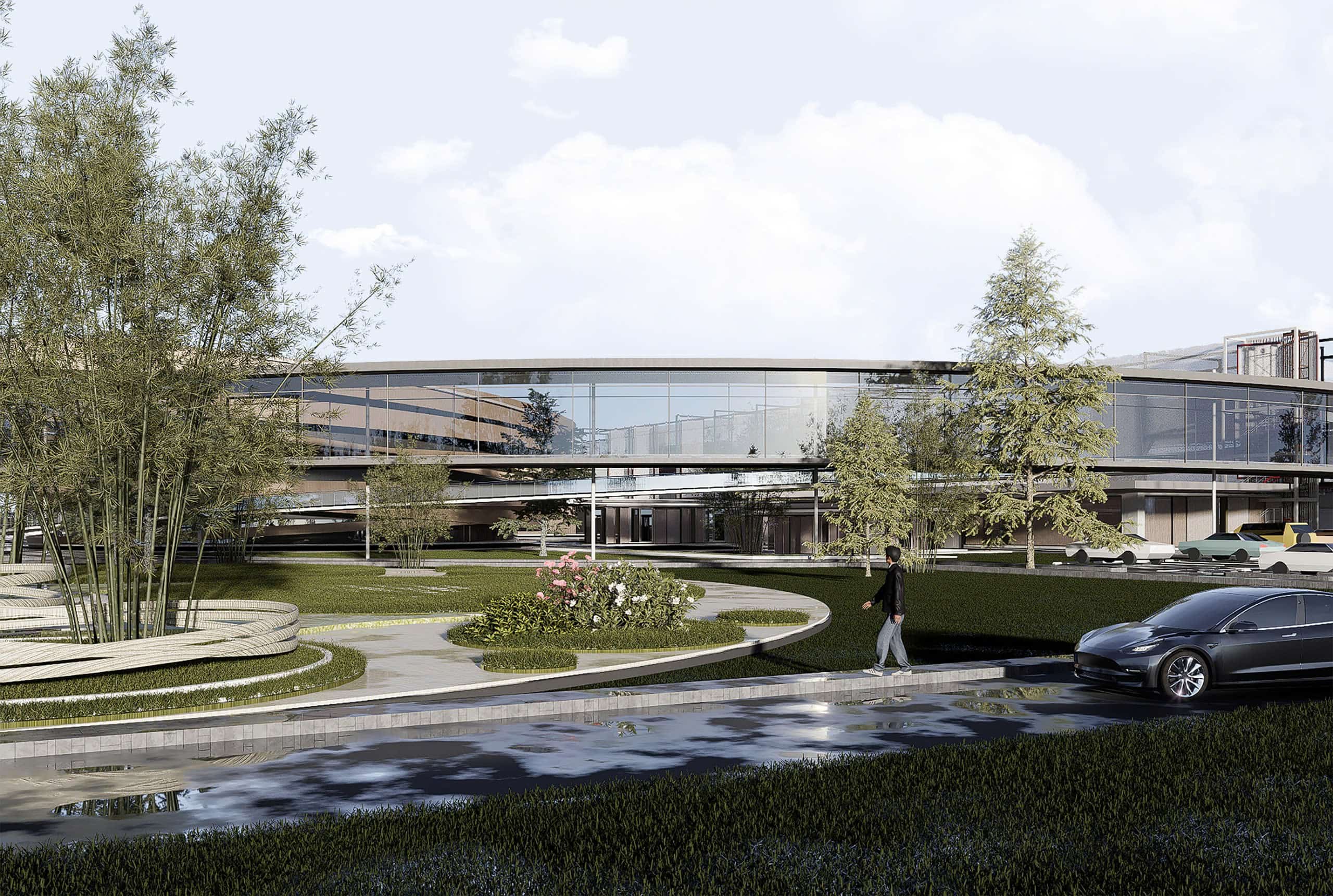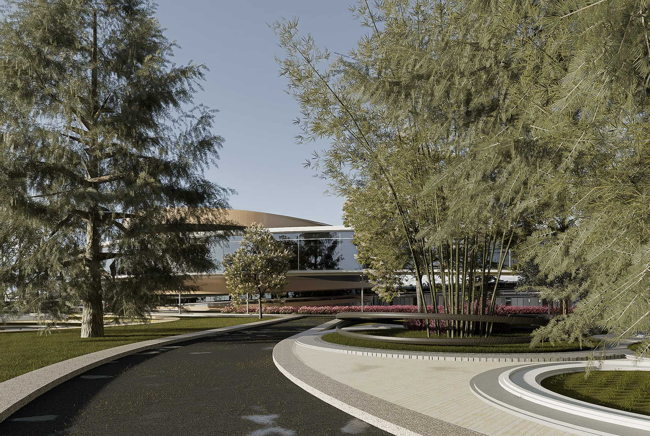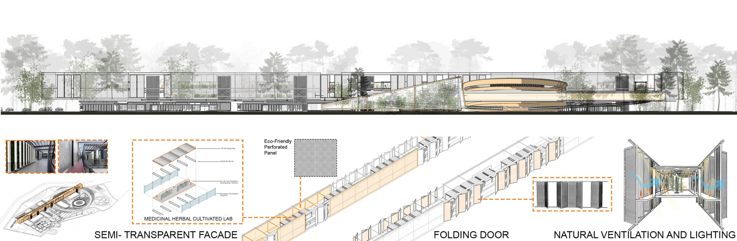The desired effect is a façade that almost instantly disappears, dissolving into the surrounding green context. In addition, “The Connected Strip” also uses the traditional folding doors of Asian architecture, which are both convenient for natural light and ventilation for the medicinal herb-cultivated labs inside, suitable for tropical climates, and creating a highlight for the facade of the building instead of just a boring metal panel running throughout.