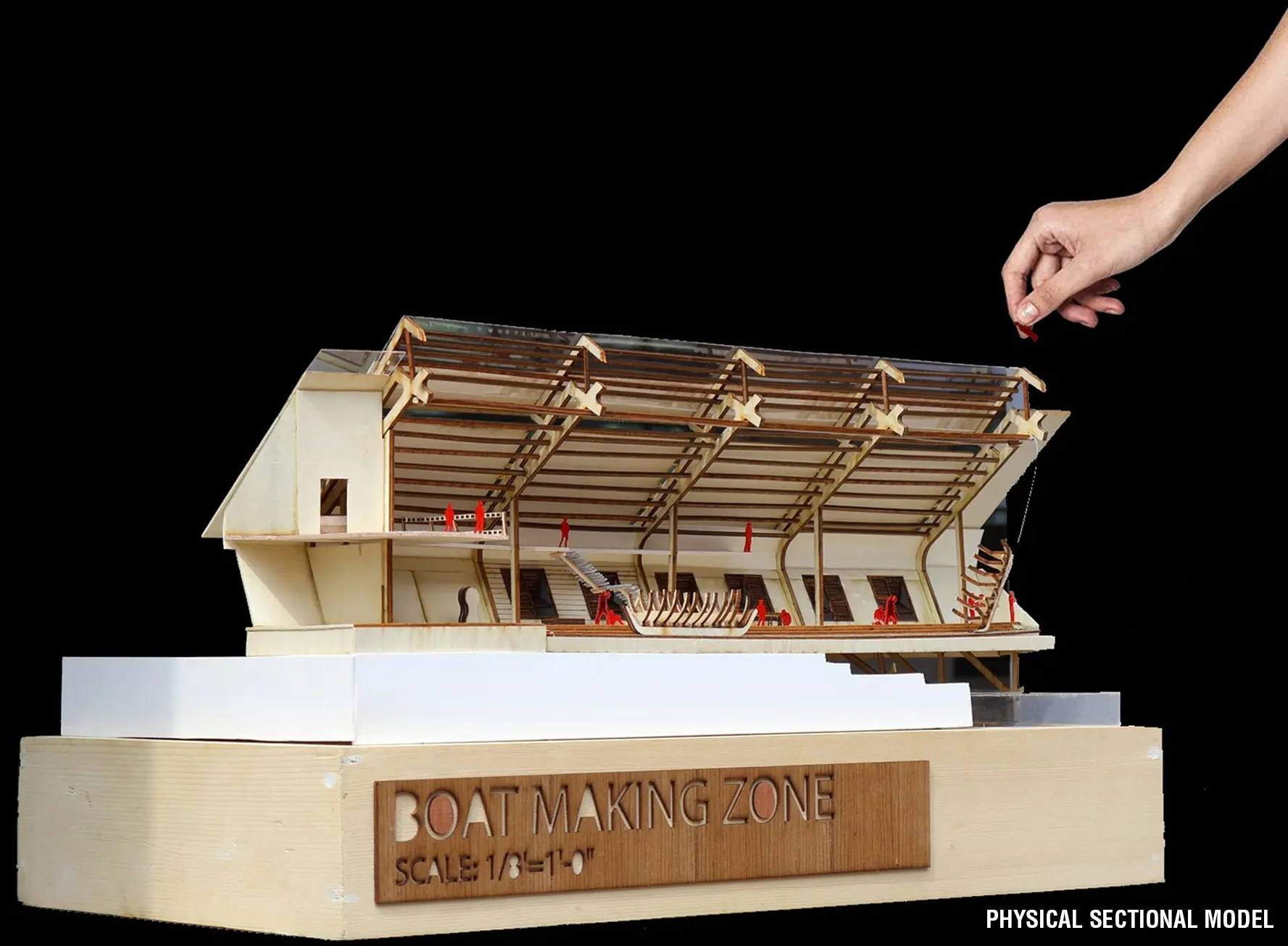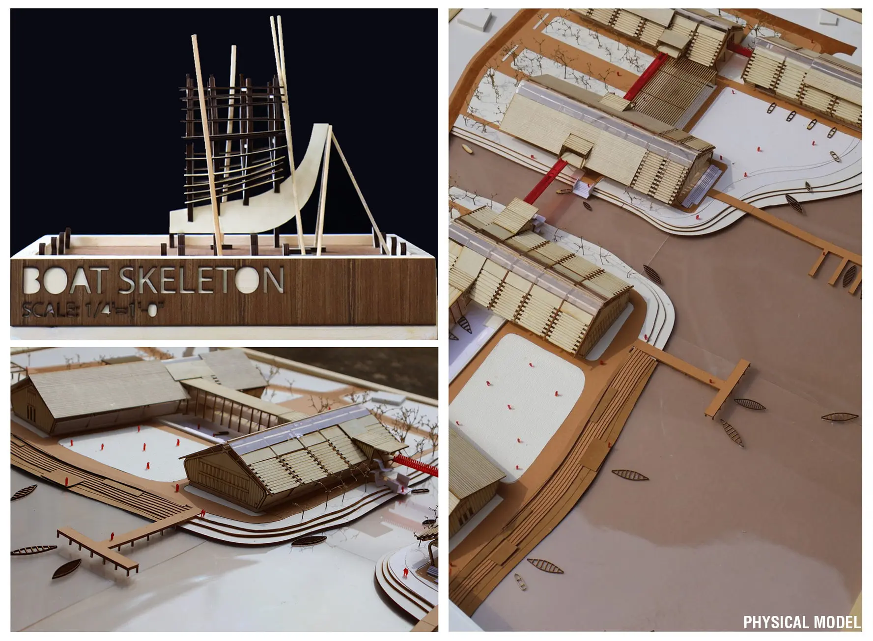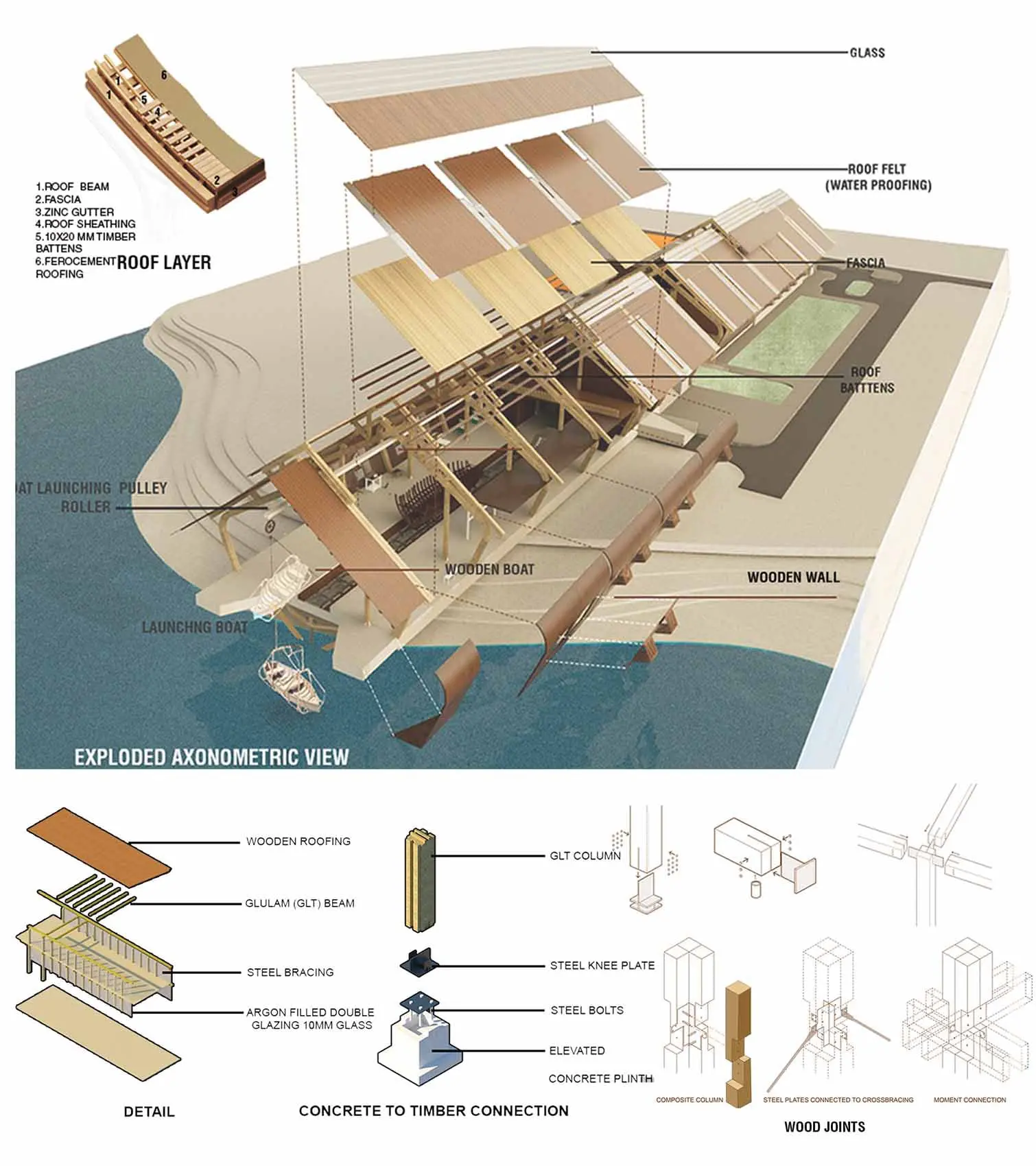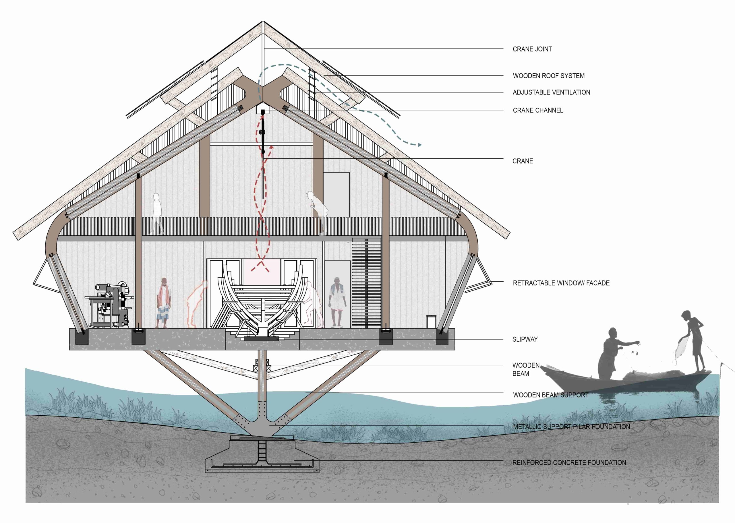 Community engagement is at the heart of the design, incorporating crafting zones, healthcare facilities, and storage areas, alongside modern boat-making zones. Public interfaces such as museums, live workshops, and temporary exhibitions foster awareness and appreciation of the craft among tourists and locals alike. The museum incorporates boats of different times and regions. In the boat making zone, the craftsmen make boats of different sizes in a traditional way (open yard) and modern way . The revival of the on-site canal and the creation of a connective bridge serve both practical and symbolic purposes, offering transport access while nurturing a serene, nature-connected public space. Using a combination of glulam timber and ferrocement, the project emphasizes sustainability, durability, and aesthetic harmony, introducing modern materials to traditional craftsmen. This “glocal” approach—blending local heritage with global sustainability innovations—supports environmental stewardship, economic growth, and cultural preservation.