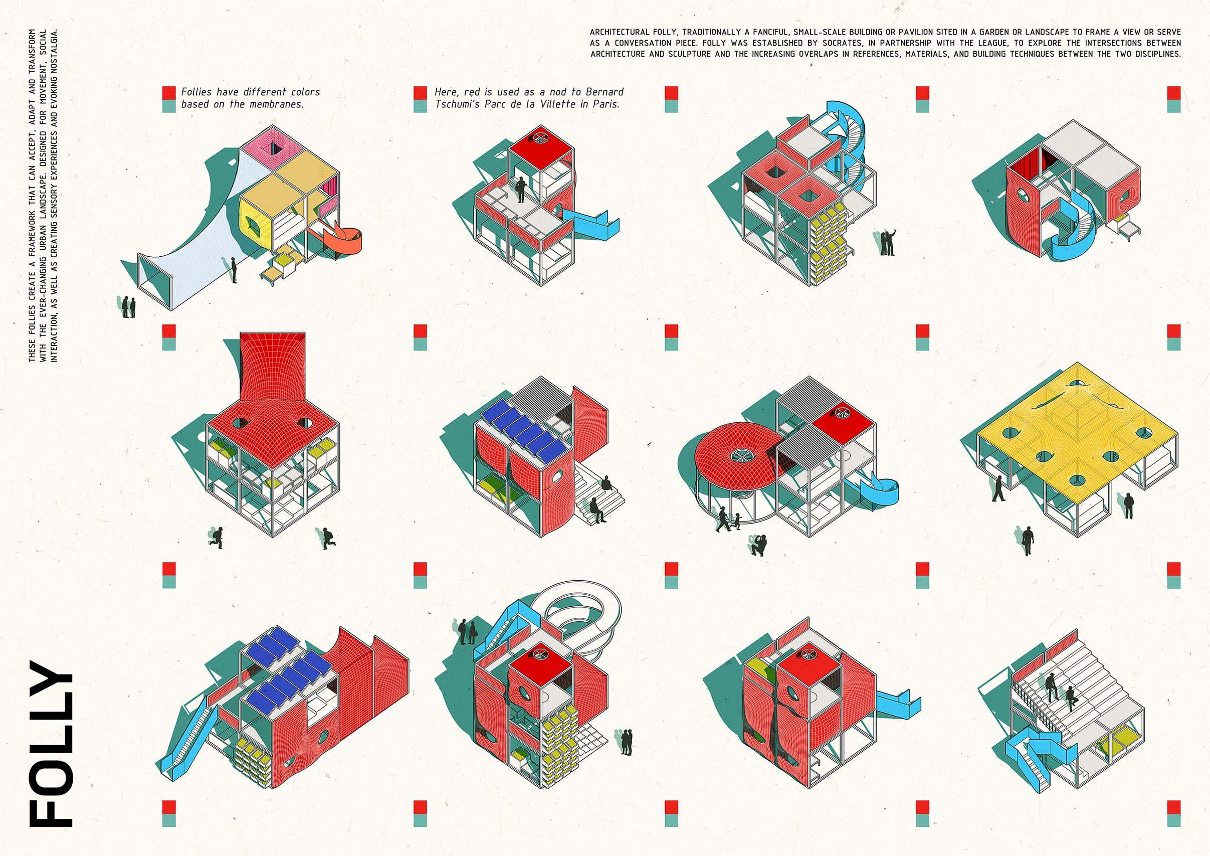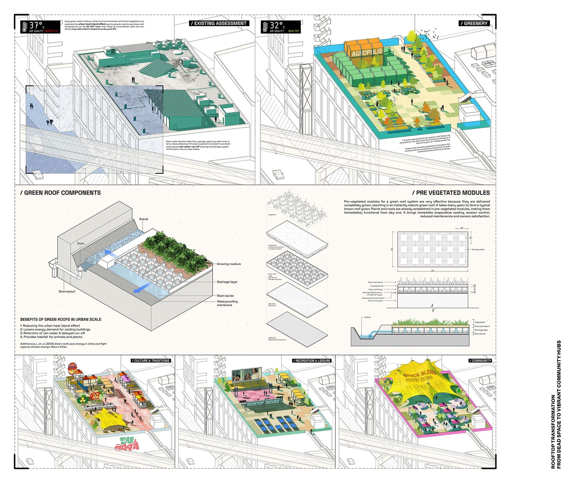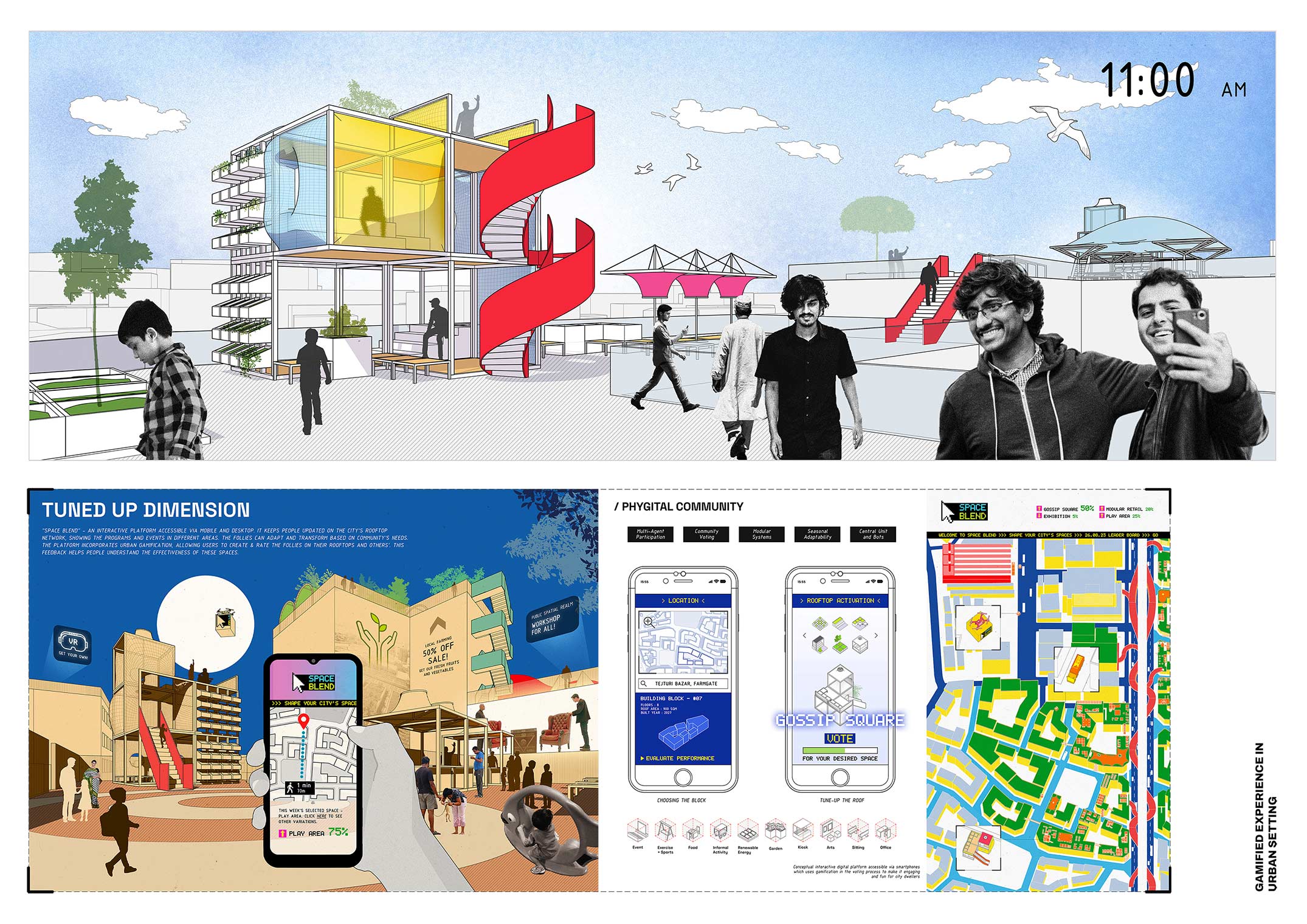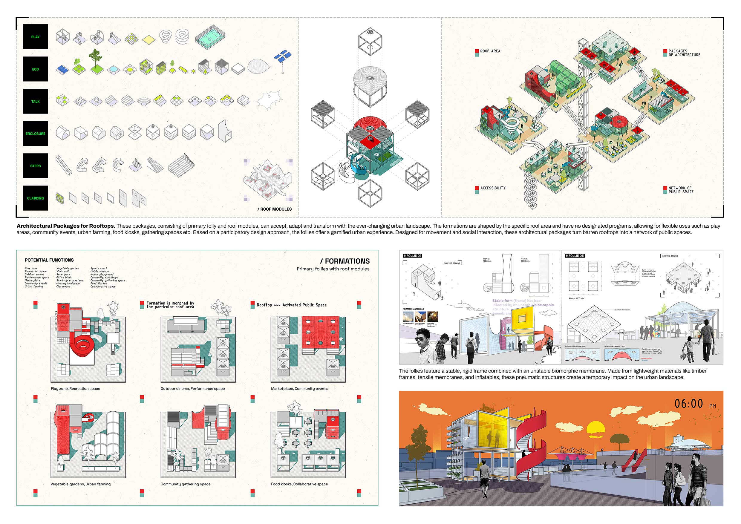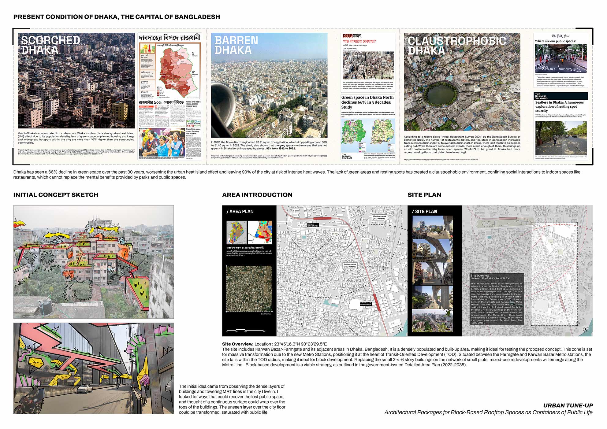 Bangladesh’s capital Dhaka offers almost no scope for creating public life, with no spaces for play, interaction, or green areas within its urban core. In this highly saturated city, rooftops represent the largest urban gap, which brings the idea of creating an interconnected network of rooftops, activated by architectural packages that transform these barren rooftops into vibrant, functional areas.