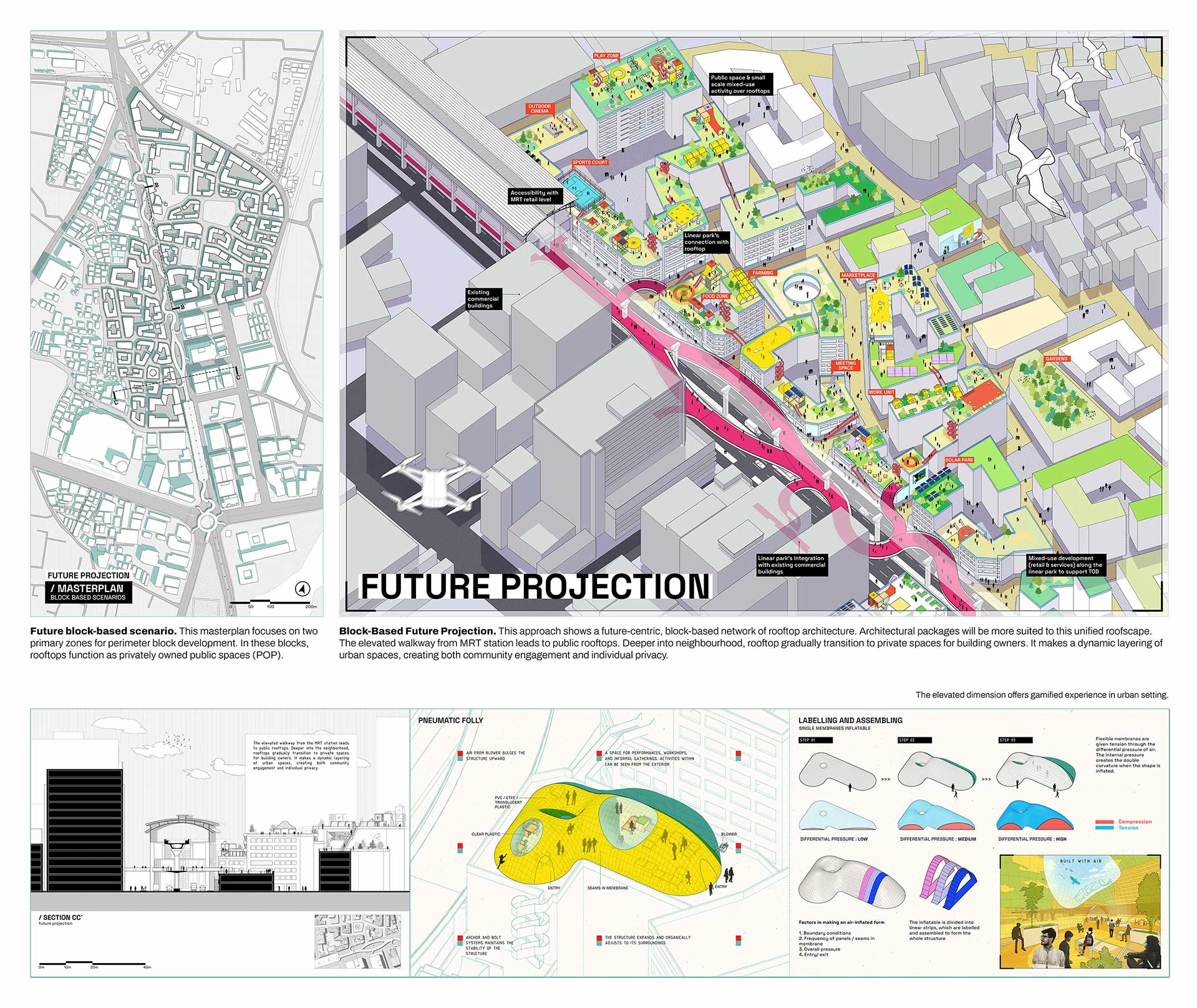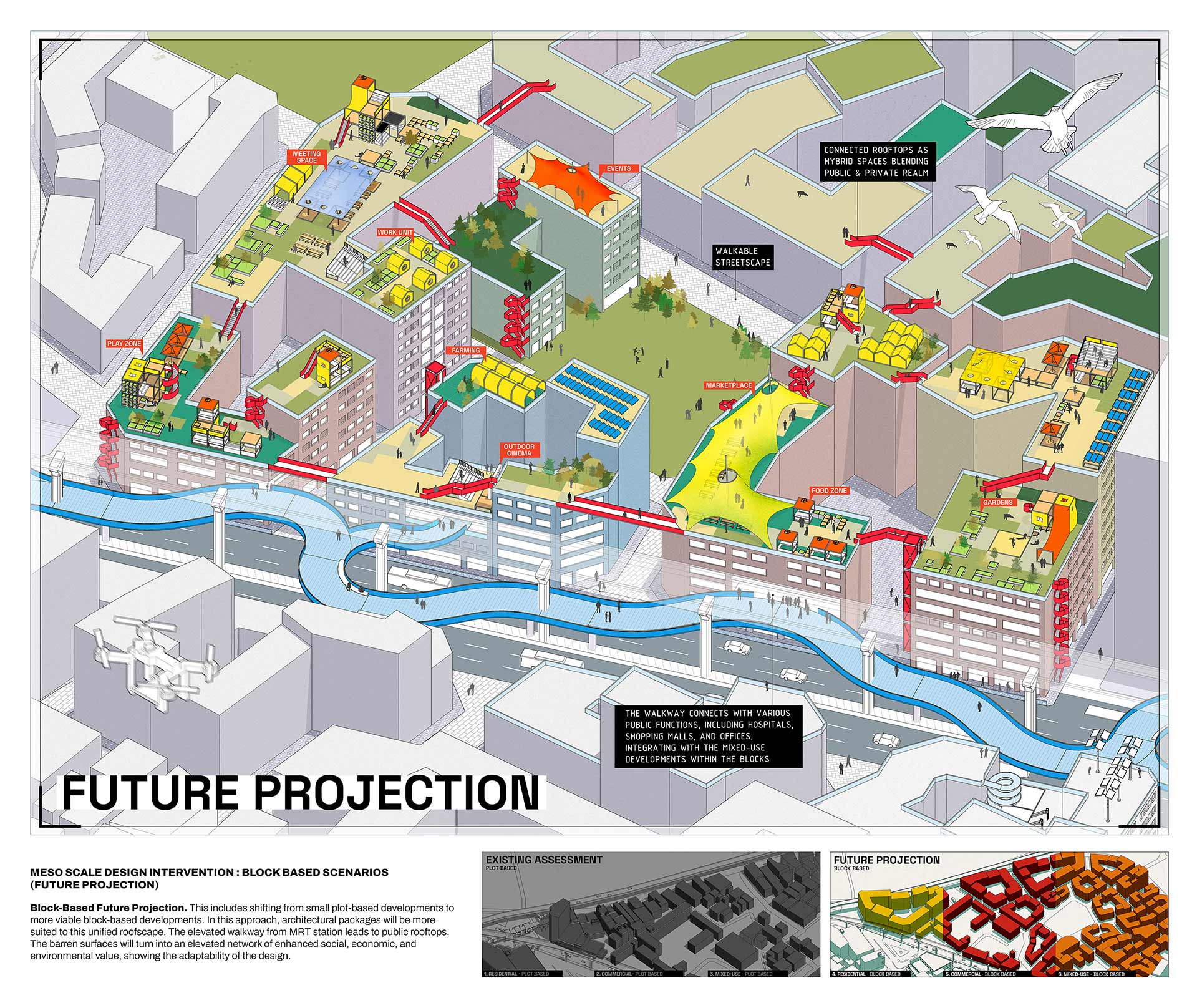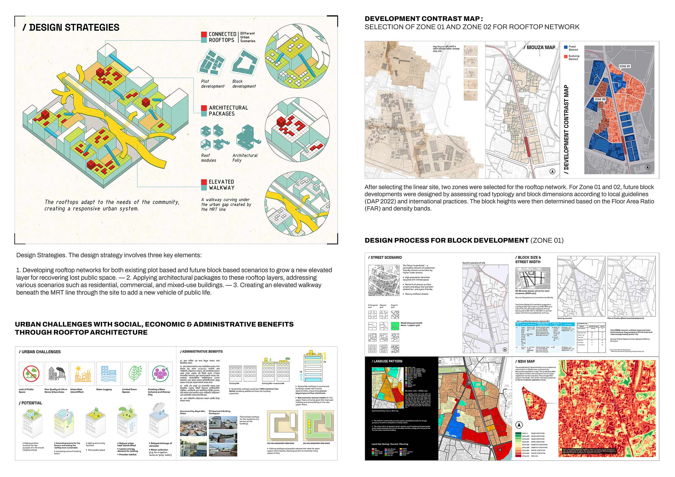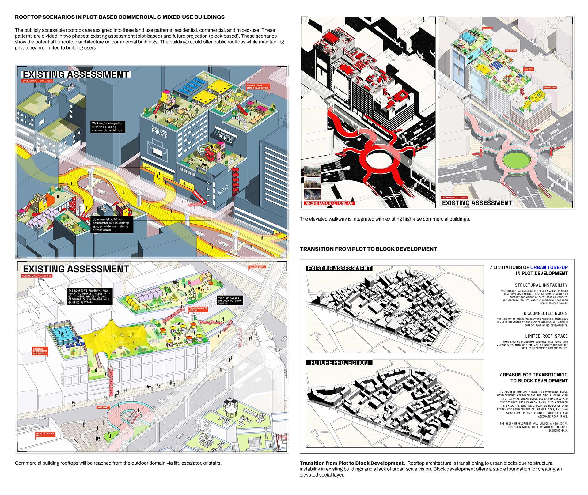 The project explores multiple plot-based & block-based rooftop scenarios to establish the new rooftop network. Adopting the idea could start a structural movement that will be followed by developers and housing corporations to invest in rooftops. It focuses on the future development of Dhaka by combining insights from local practices (Detailed Area Plan 2022, Dhaka) with international urban design approaches. If recognized, this project could reach out to various stakeholders from government and non-government organizations. It might lead to small-scale implementation of urban tune-up as a starting point, rethinking rooftops as an elevated layer of enhanced social, economic, and environmental value.