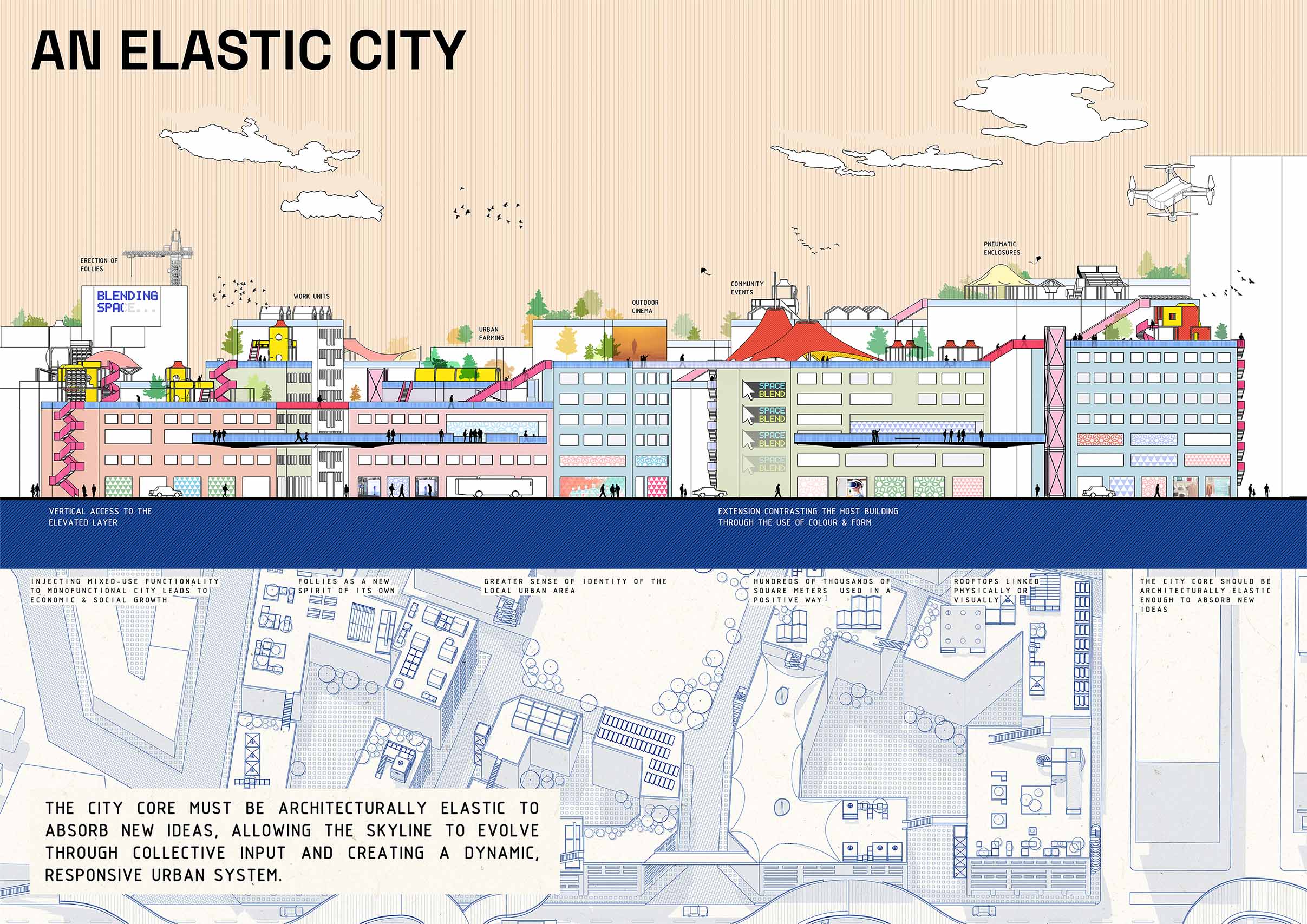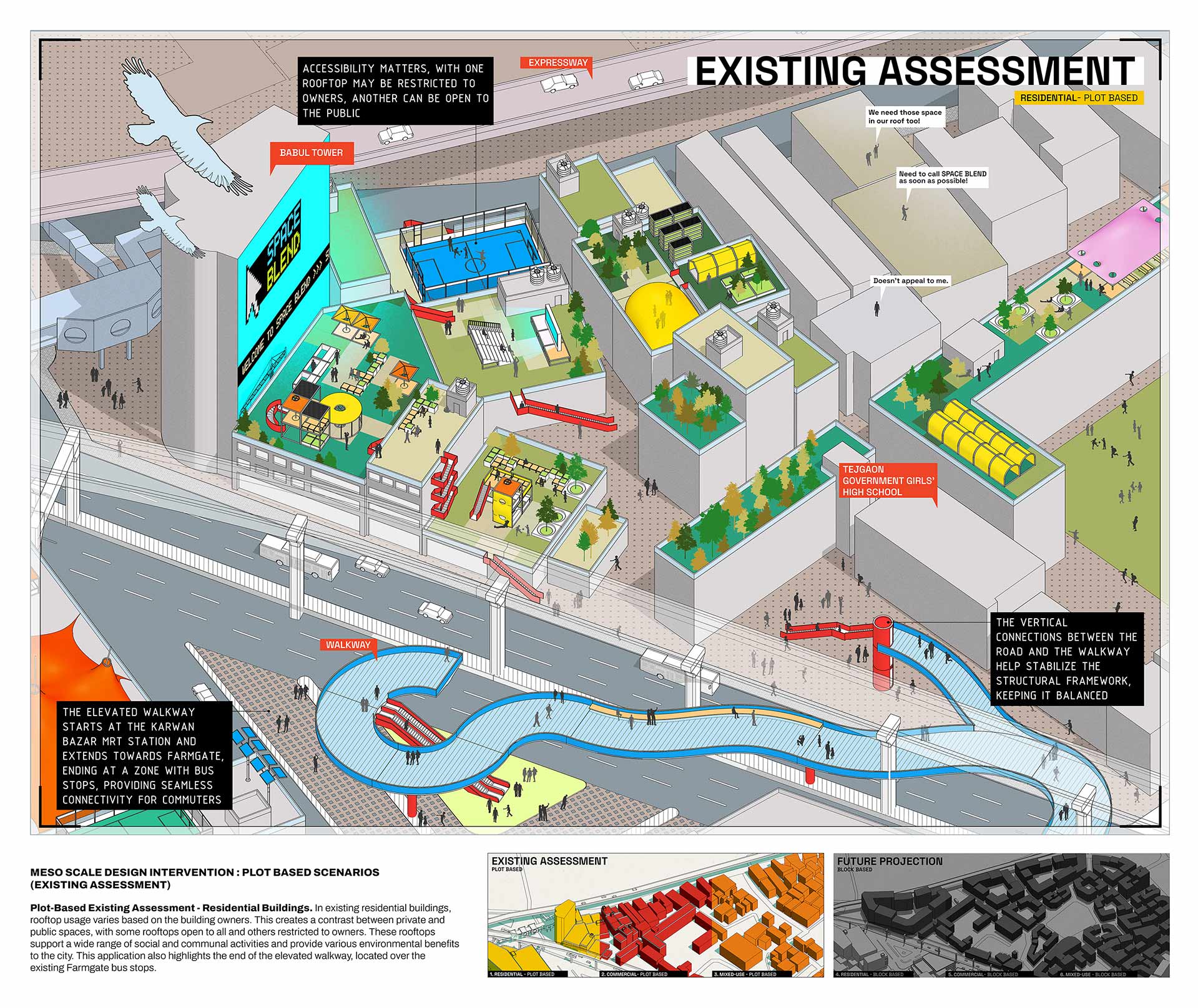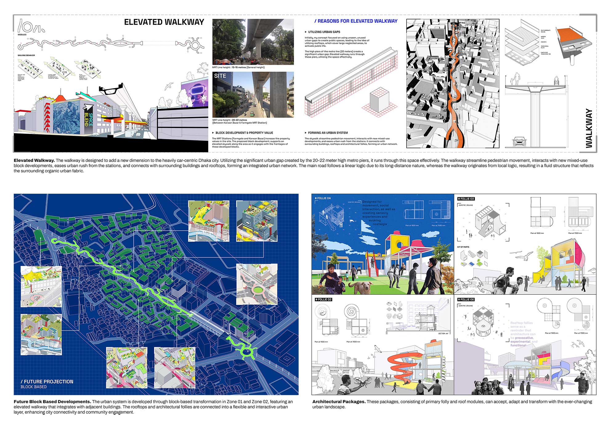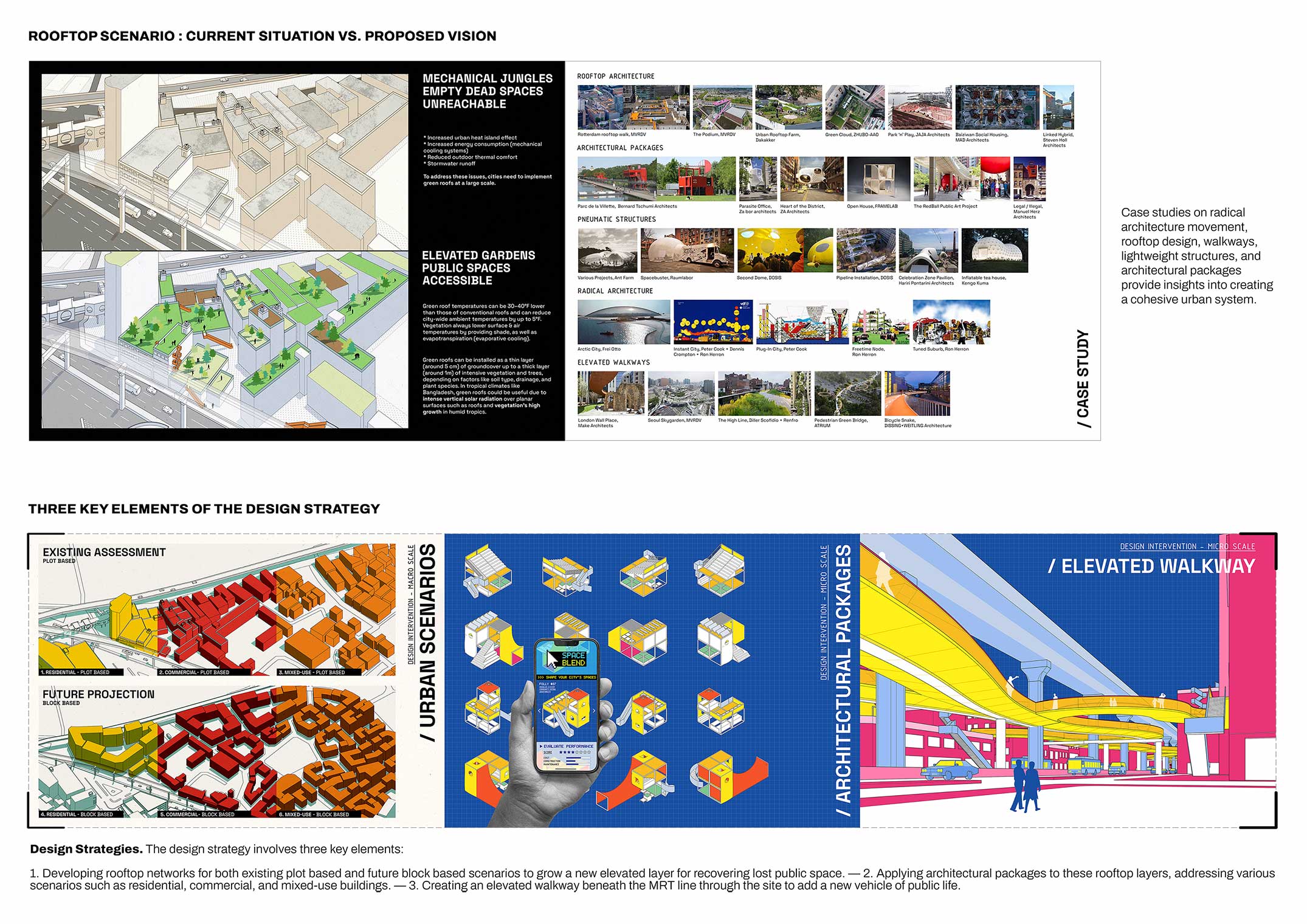 Bangladesh’s capital Dhaka offers almost no scope for creating public life. The city is almost lifeless with no spaces for play, interaction, or open green areas within its urban core. Middle- and lower-income residents find social life nearly invisible. Public spaces and open areas are practically missing at the city floor level in Dhaka’s dense urban fabric. During Dhaka’s scattered development, many unseen, leftover spaces have emerged, which lack interaction with city life. These spaces hold untapped potential. In this highly saturated city, rooftops represent the largest urban gap. The idea is to create an interconnected network of rooftops, activated by architectural packages that transform these barren rooftops into vibrant, functional areas. This new elevated layer will bring back social interaction, provide community facilities, and reintroduce green spaces into the urban environment. Typically, parks serve as an escape from the city. Here, however, parks will be an embedded part of the city’s urban infrastructure at an elevated dimension.